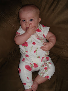 Our chunky monkey is 19 1/2 pounds (90%), 25 1/2 in. long (50%) and her head is in the 90% too. He said she is doing great and really happy with her sleeping 11 hours a night. She is doing better eating cereal.......I switched from rice to oatmeal. She has only eaten peas but did great with them so we'll see how the others go. He is referring us to a dermatologist to have her birthmark looked at, which I'm happy about. I'm sure it will take a while to get in but at least we'll have something scheduled to get it checked out. All in all she's a happy & healthy little girl.I took these pics earlier this week. I've been trying to get her rolling over on video but still haven't gotten it. I love her little plaid skirt in these pics.